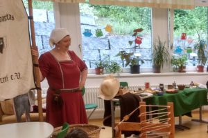 Die Schülerinnen und Schüler durften hautnah erleben, welche Nahrungsmittel es im Mittelalter nicht gab, dass gewobene Bänder praktisch unzerreißbar sind oder dass man vor einem wütenden Ritter in voller Rüstung besser die Flucht ergreifen sollte.